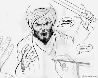 Now consider the second cartoon, which was the winner of the Draw Mohammed contest that was attacked by two radicalized American Muslims on May 3rd. While whether it is more offensive than the Jesus memes is certainly up for debate, I don't think it is because it's an accurate portrayal of how a large and extremely violent cohort of the Muslim world views the core Western value of freedom of expression while the Jesus memes are just childishly deliberate, contemptuous mockery of the Christian deity without any basis or even interest at all in fact or accuracy.